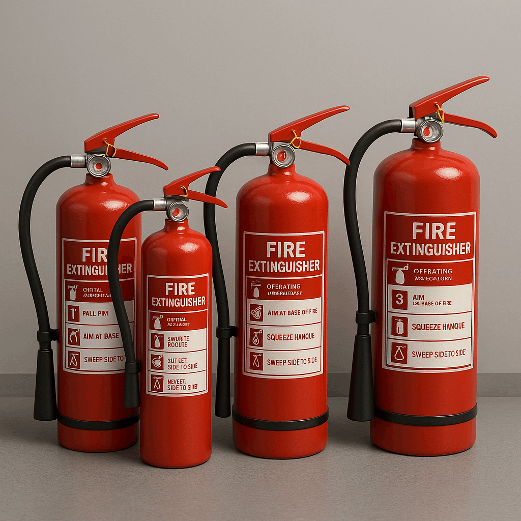 Venda de extintores de incêndio novos para todos os tipos de fogo (Água, Espuma, CO₂, Pó Químico e Classe K).